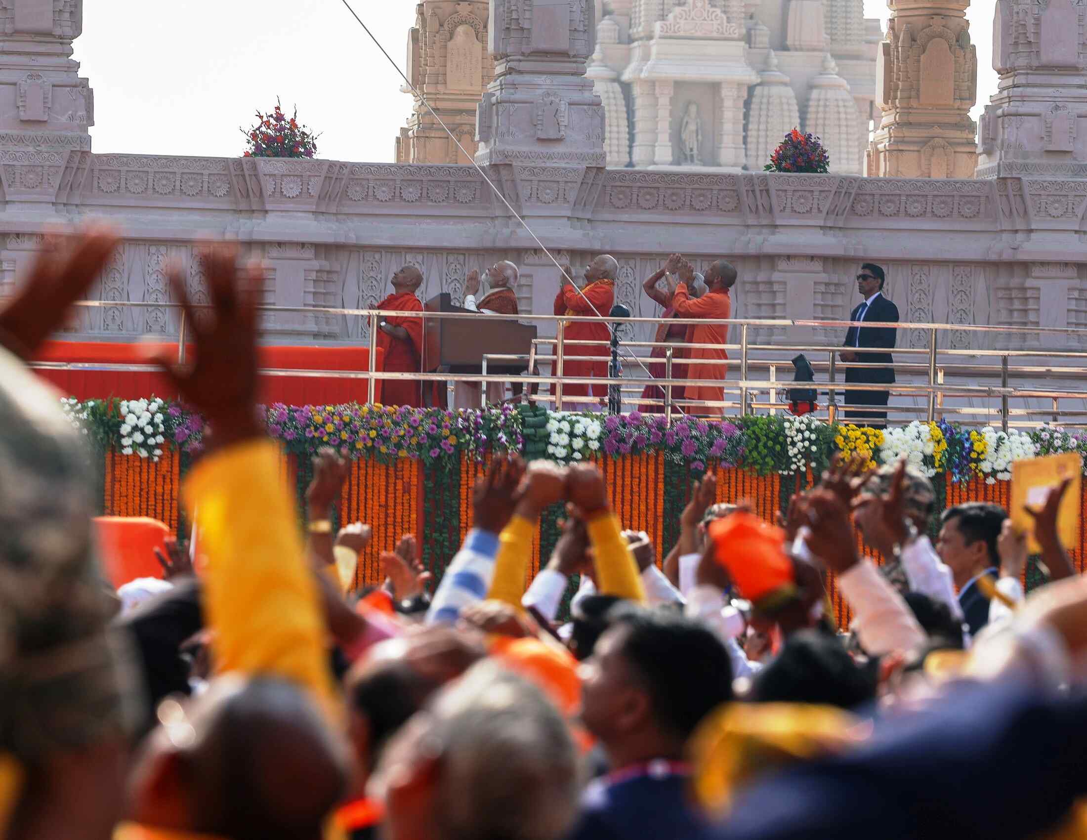 हालांकि उम्मीद थी कि अमिताभ बच्चन सहित कई फिल्मी हस्तियां कार्यक्रम में शिरकत करेंगी, लेकिन कोई सेलिब्रिटी नहीं पहुंचा। फिर भी देशभर के प्रतिष्ठित मठों के संत और बड़े अखाड़ों के प्रतिनिधि बड़ी संख्या में मौजूद रहे। चारों शंकराचार्य पहले ही अपनी असहमति जता चुके थे, इसलिए वे उपस्थित नहीं थे। अयोध्या को आज 1000 क्विंटल फूलों से सजाया गया और सुरक्षा इतनी सख्त रही कि मंदिर परिसर में पांच स्तरीय सुरक्षा घेरा बनाया गया—ATS, NSG, SPG, CRPF और PAC हर ओर तैनात थे।