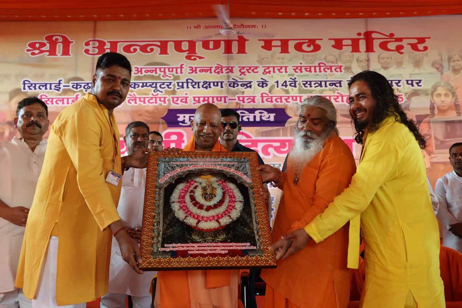 वाराणसी। उत्तर प्रदेश के मुख्यमंत्री योगी आदित्यनाथ ने अपने दो दिवसीय दौरे के पहले दिन सोमवार को शिवपुर स्थित अन्नपुर्णा ऋषिकुल ब्रह्मचर्याश्रम संस्कृत महाविद्यालय में आयोजित काशी अन्नपूर्णा अन्न क्षेत्र ट्रस्ट द्वारा संचालित सिलाई-कढ़ाई एवं कंप्यूटर प्रशिक्षण केंद्र के 14वें सत्रांत के अवसर पर लगभग 250 बालक-बालिकाओं को सिलाई मशीन लैपटॉप एवं प्रमाण पत्र का वितरण किया। मुख्यमंत्री योगी आदित्यनाथ ने लोगो को संबोधित करते हुए कार्यक्रम के भव्य आयोजन हेतु अन्नपुर्णा आश्रम के महंत शंकर पुरी को धन्यवाद दिया।